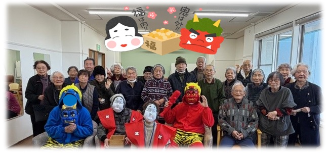 養護老人ホーム 楽翁荘豆まきをしました!!今日2月3日は節分です!! 楽翁荘にも鬼がやってきました(;゚Д゚) まずは、年男年女の方から玄関から入ってくる鬼へ!! 「鬼はーそとー!!福はーうち -