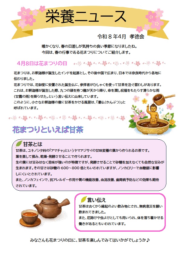 お知らせ 令和8年 🌸4月号栄養ニュース🌸 2026年03月31日 春風の心地よい季節となりました(*´ω`*) 春と言えば…(。´・ω・)? 入学式、入社式、お花見 などなど思い浮かびますよね。 今回孝徳会栄養ニュースでは花まつりについて掲載しております😄 是非ご観覧ください♫